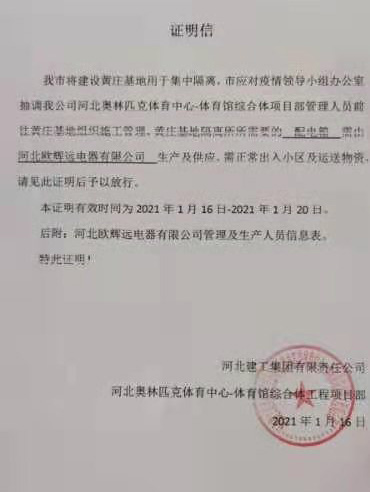 疫情的卷土重來(lái),一夜之間,昔日人流熙攘的石家莊,瞬間安靜了下來(lái),小區(qū)、村莊封閉,交通停止,各方志愿者們奮斗在一線(xiàn),為老百姓的民生保障默默的貢獻(xiàn)著自己的一份力量。而我們歐輝遠(yuǎn)人也絲毫不遜色,全力配合政府部門(mén)加入到石家莊黃莊公寓集中隔離點(diǎn)的建設(shè)當(dāng)中,為了保證集中隔離點(diǎn)的順利供電,徹夜奮戰(zhàn),不畏嚴(yán)寒,爭(zhēng)分奪秒,與疫情賽跑,彰顯人間大愛(ài)!